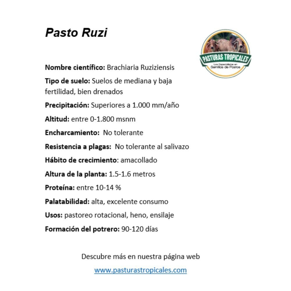 Brachiaria ruziziensis o pasto Ruzi. Es una planta perenne con gran adaptación a un amplio tipo de suelos, desde arcillosos hasta arenosos. Requiere suelos de buena fertilidad. Esta especie no tolera encharcamiento.