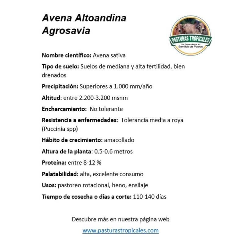 Su nombre científico es Avena sativa, es una planta forrajera ideal para corte y ensilaje. Se adapta entre 2.200-3.200 msnm. Produce entre 30-50 toneladas de forraje verde por corte en un periodo de entre 110-140 días.