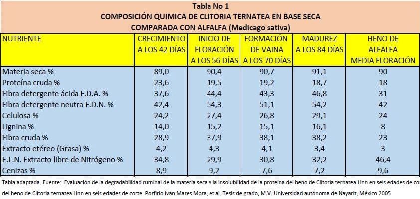Clitoria ternatea es una leguminosa que produce forraje abundante. Es un cultivo por lo general libre de plagas. Si se hace un cultivo correcto produce grandes cantidades de forraje de alto valor nutricional.