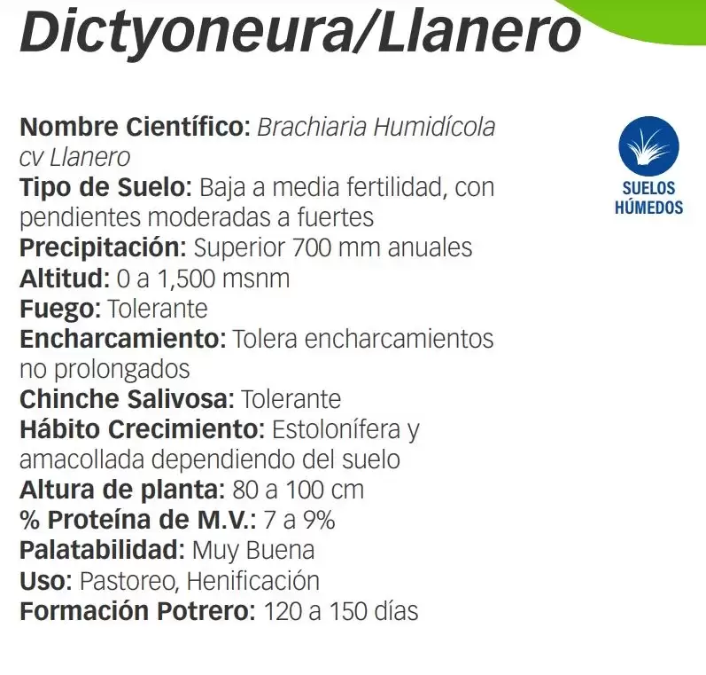 Brachiaria dictyoneura también conocida como pasto Llanero es una especie de gran adaptación a suelos ácidos y de baja fertilidad. Es tolerante a sequía y a plagas como el salivazo.
